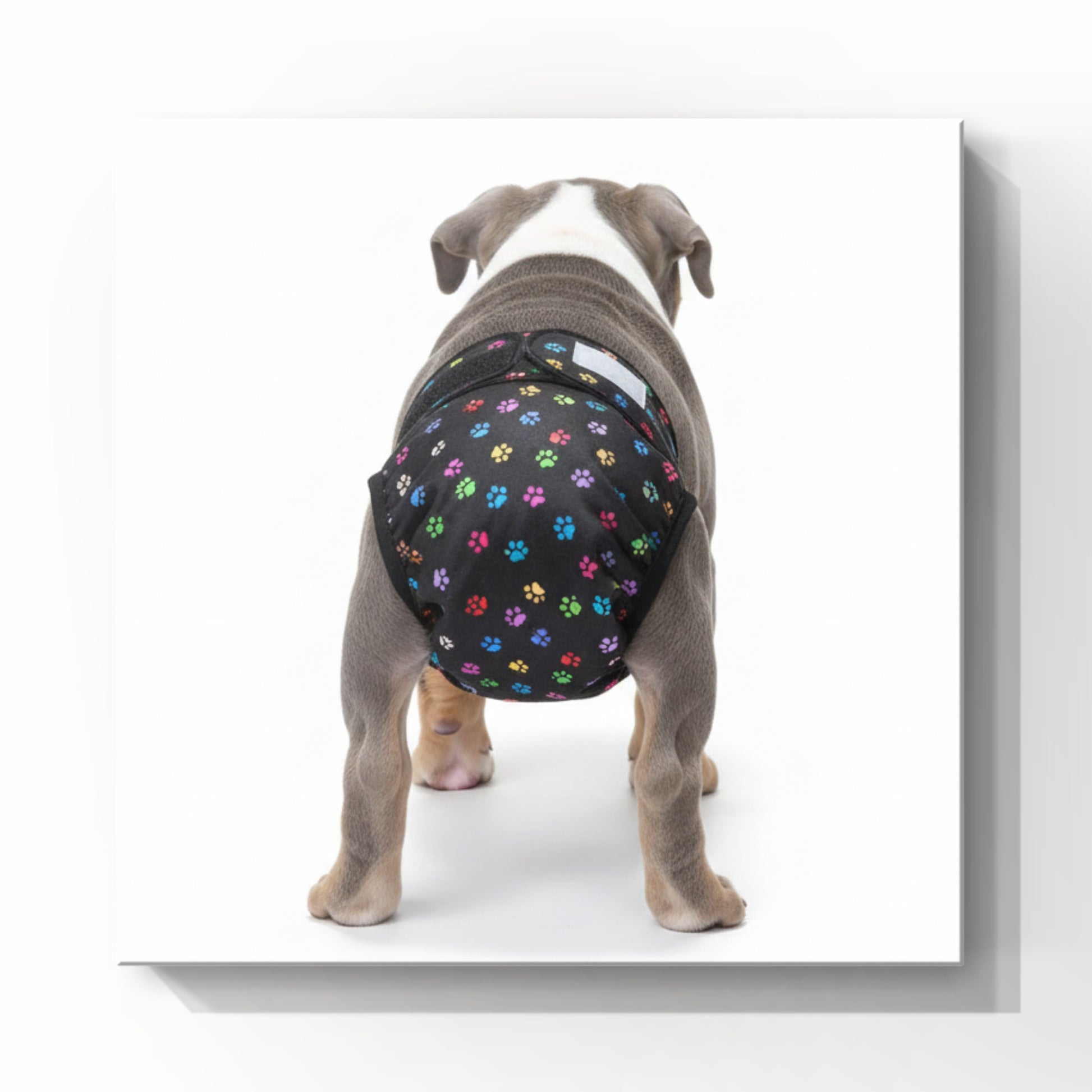 Finally, a diaper designed specifically for dogs without tails. Hand-sewn in our Collingwood, Ontario studio for 20 years, our No-Tail "Full Coverage" diapers are designed to be used with washable or disposable pads (sold separately). Our washable pads feature velcro tabs for secure attachment, while disposable pads use adhesive tabs. If you are tired of diapers failing because your dog has a stubby tail or no tail at all, this tailored design is your solution.